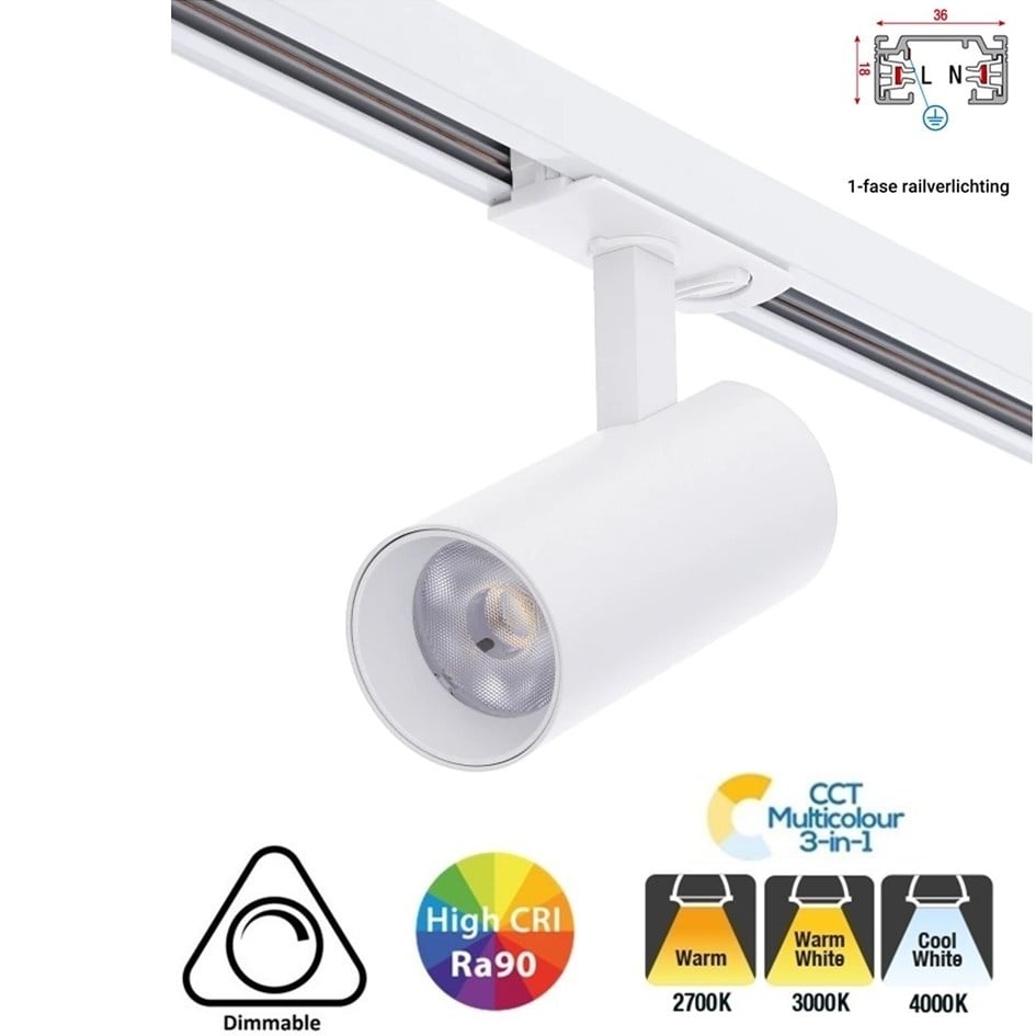 De 10w Rail spot wordt geleverd met geïntegreerde LED. De spot in instelbaar met een CCT-Switch in lichtkleur 2700K warm wit, 3000K warm wit en 4000K neutraal wit. De spot is voorzien van hoogwaardige TRIAC Dimbare LED Driver. De Led spot is zeer goed dimbaar met één van onze A merk LED Dimmers.