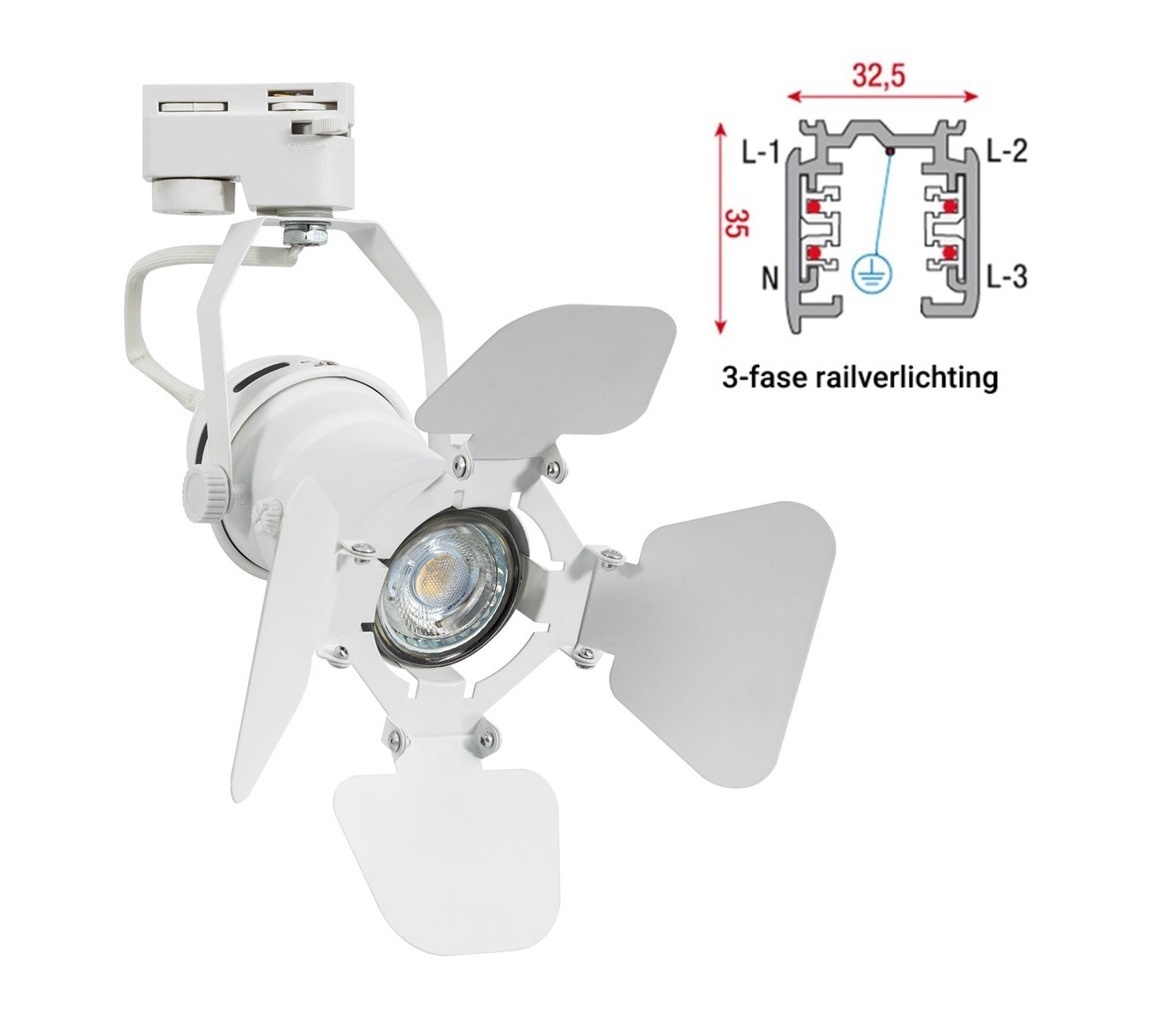 3 Fase Rail armatuur SpotLight met GU10 Fitting, Witkleurige behuizing