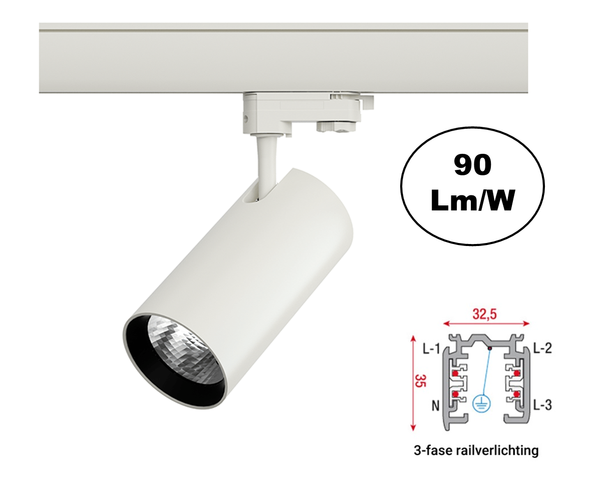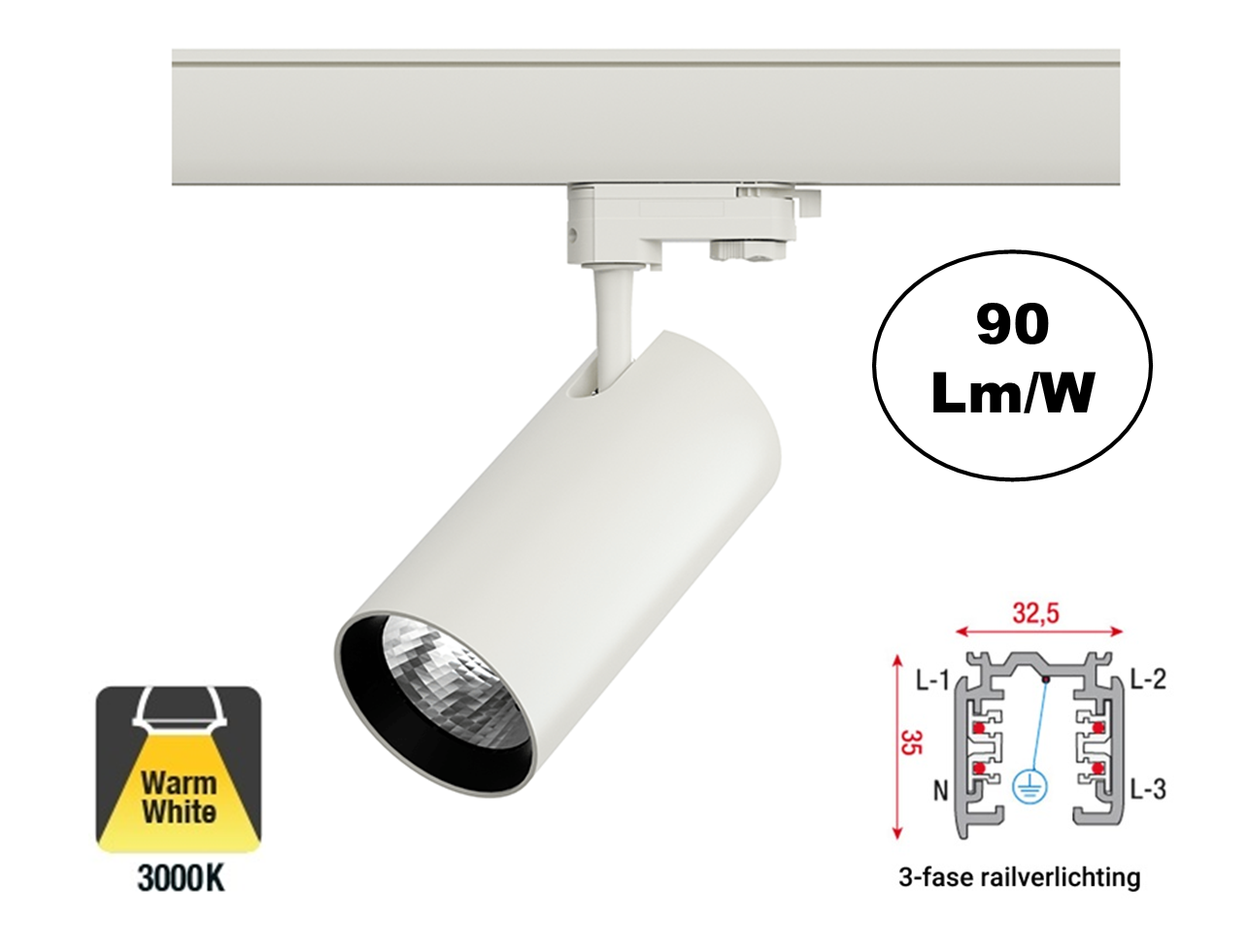 3 Fase Rail Spot Era 20w, 1800 Lumen, Witkleurige behuizing, 2 Jaar Garantie
