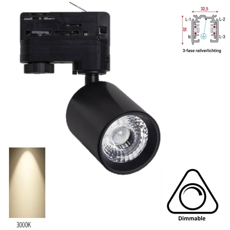 3 Fase Rail Spot Mal, 10w, 1000 Lumen, Dimbaar, Lichthoek:15 graden, Zwart, 2 Jaar garantie