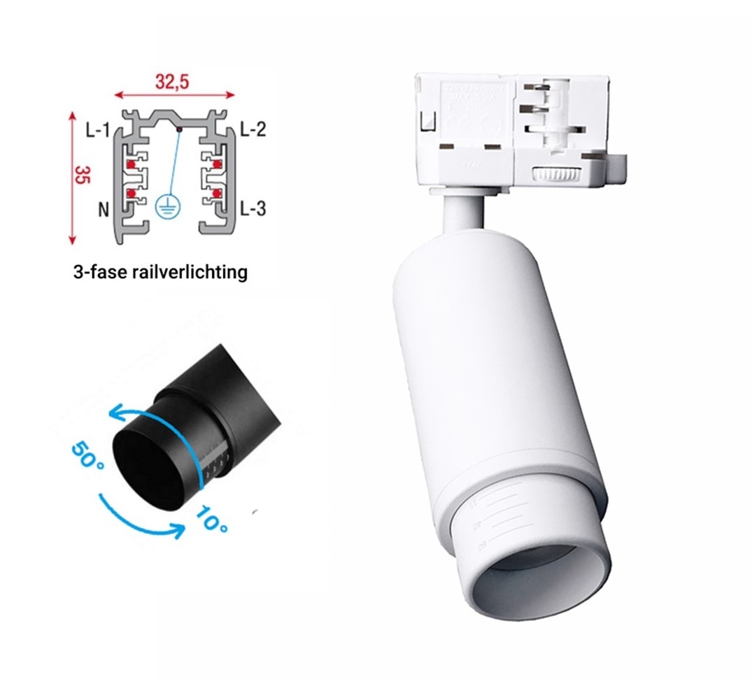3 Fase Rail Spot met GU10 Fitting, Lange Koker met Verstelbare Lens 10°-50° , Witkleurige behuizing