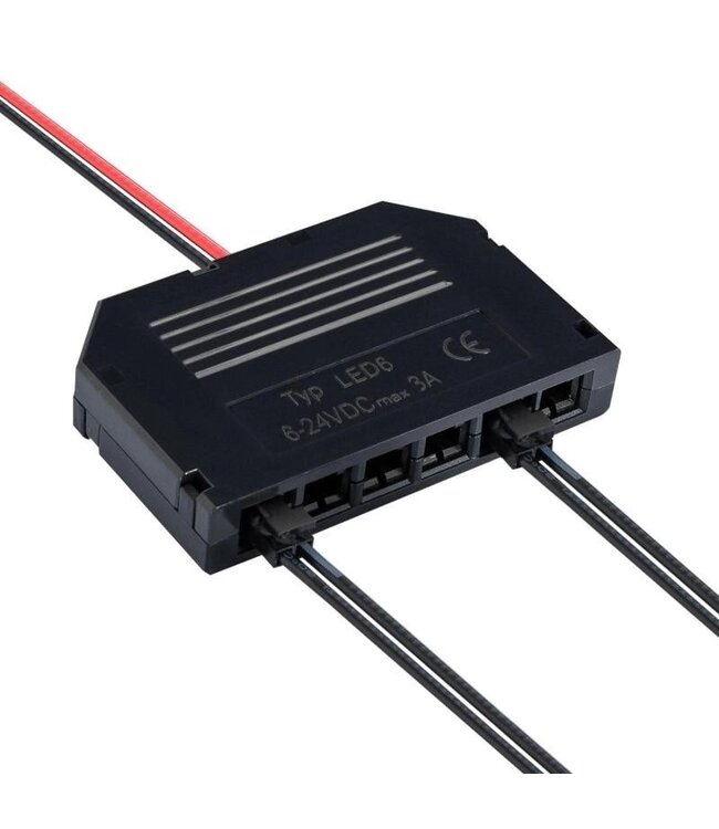 6 Uitgangsverdeler connector voor LED strips met 6 vrouwelijke ingangen voor kabels met Male snelkoppeling (artikelnummer LDA2591).
