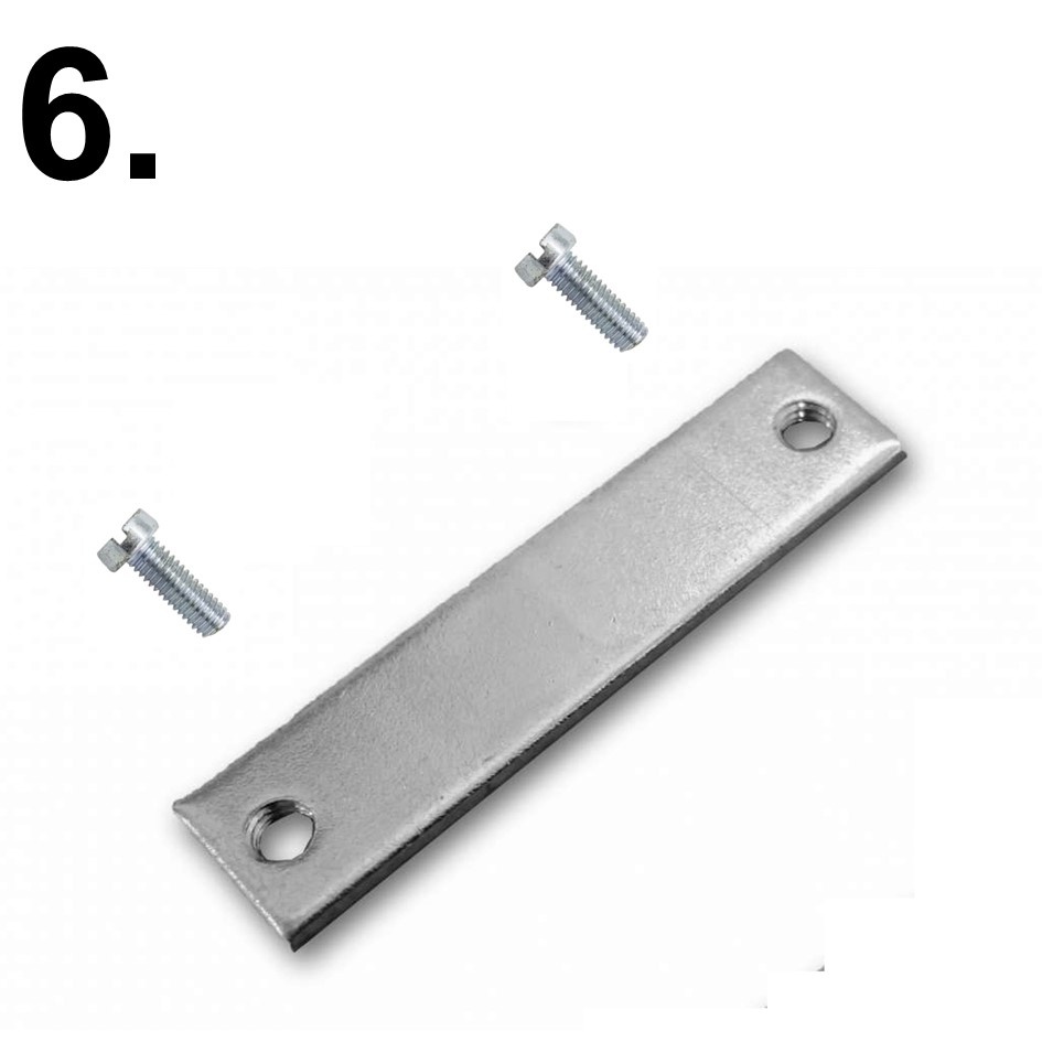 Verbindingsset nummer 6. Deze verbindingsset is bedoelt wanneer je bij de 15 graden of 30 graden hoek 2 of meer losse lengte profielen aan elkaar wilt monteren om de juiste lengte te kunnen behalen. De set wordt geleverd met 2 bouten. Voor montage van 2 profielen tegen elkaar, dient nog 2 gaatje in het midden van het profiel geboord te worden. De bout kan je vanuit binnen naar buiten aan het plaatje schroeven.