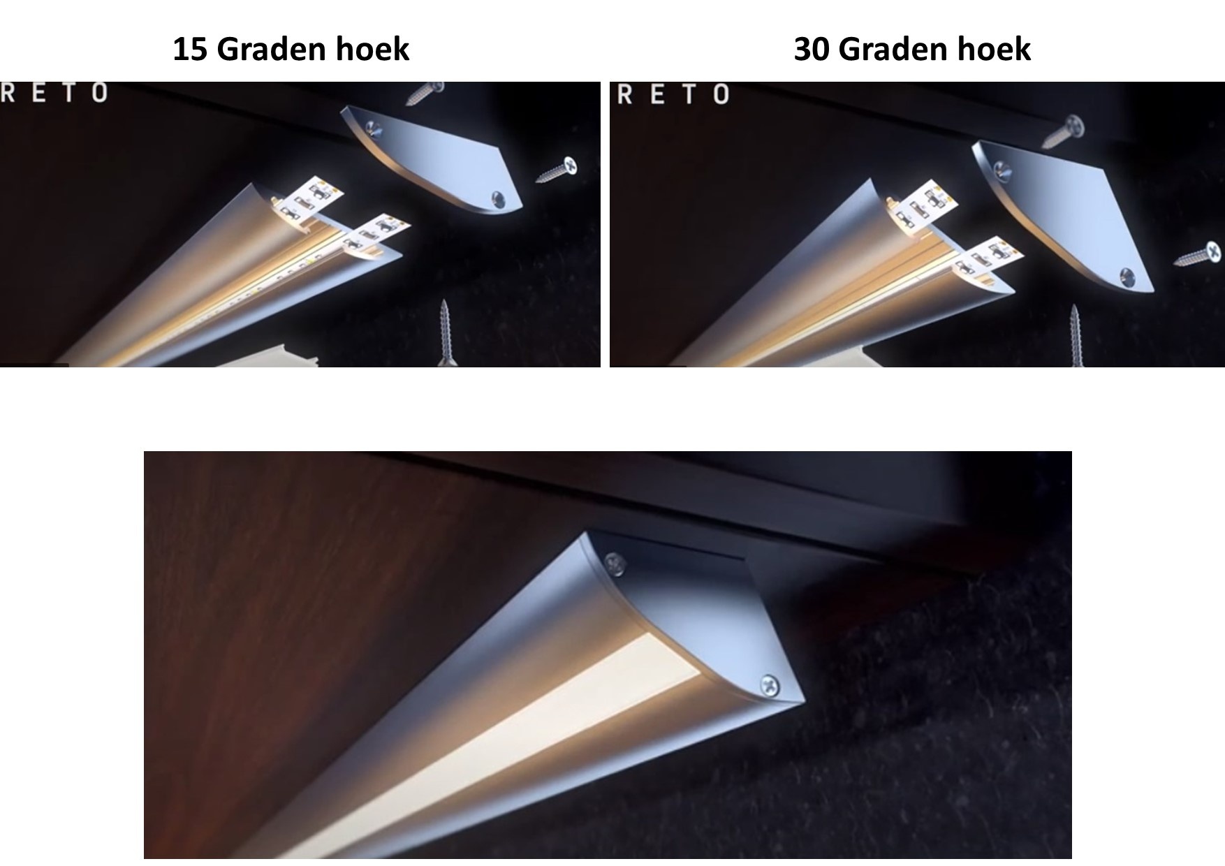 Met de aluminium afdekplaatjes nummers 4 en 5 kan je het RETO profiel in een 15 graden of 30 graden hoek monteren. De sets worden geleverd met een linkse en rechtse hoek en zijn gemaakt van aluminium. De hoeken monteer je aan de kast/wand/muur waarna je het profiel monteert op de hoeken.