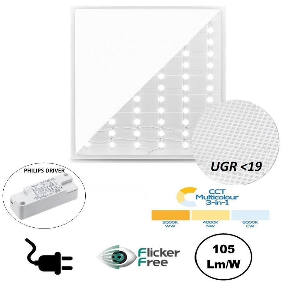 Back-lit UGR19 LED Paneel 30x30cm, 15w, 1575 Lumen (105lm/w), Color Switch (3000/4000/6000K), Flikkervrije Philips LED Driver, Stekkerklaar, 3 Jaar Garantie