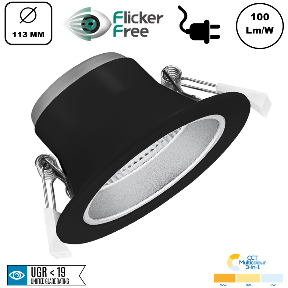 CCT Reflector Led Downlighter Zwart 10w, 850-1000 Lumen, gatmaat Ø90mm, UGR19, Stekkerklaar, 3 Jaar Garantie