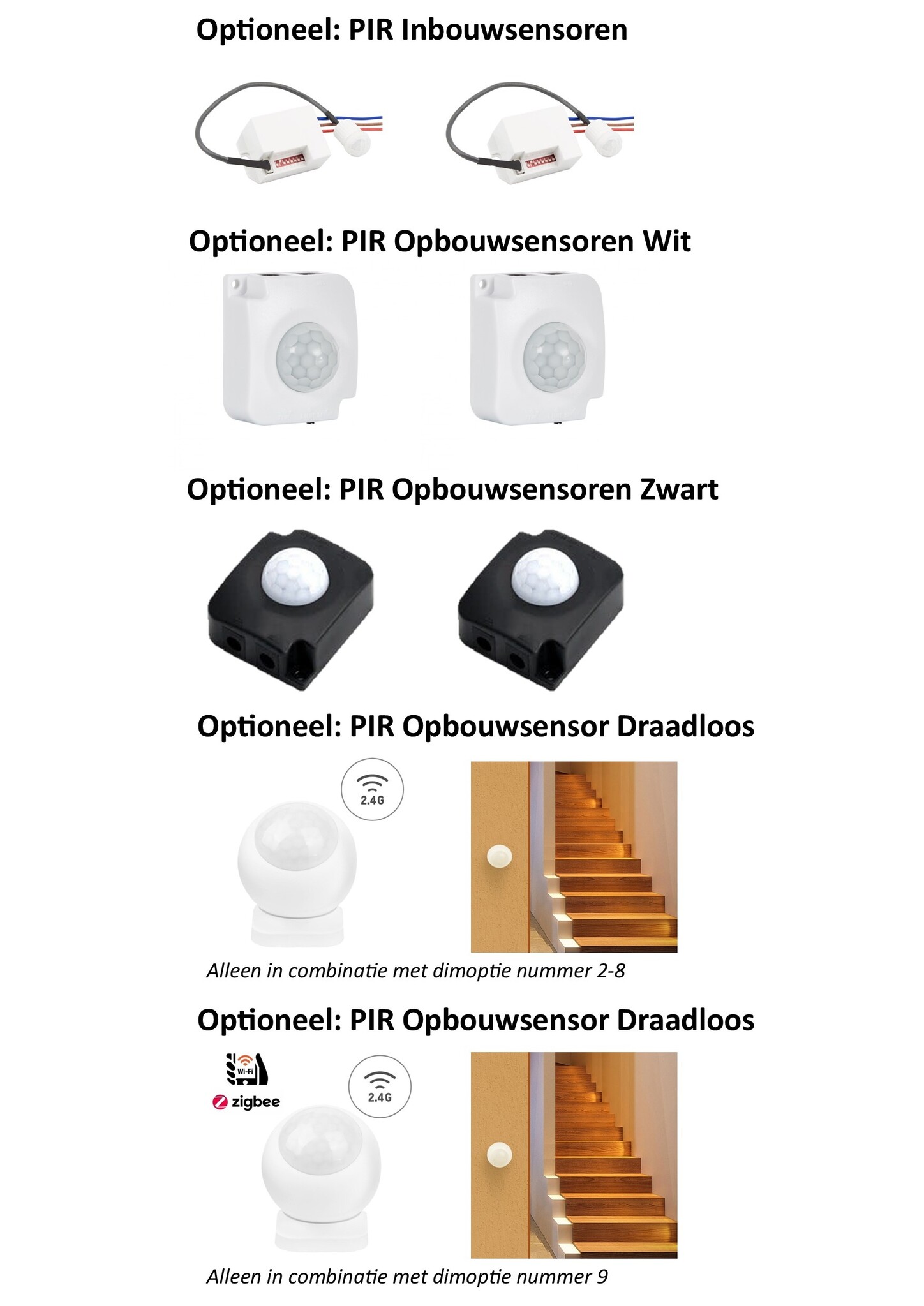 Het is mogelijk de Trapverlichting uit te breiden met een LED Dimmer en/of een Bewegingssensor.
