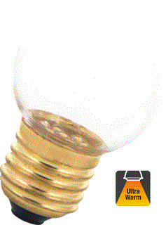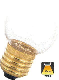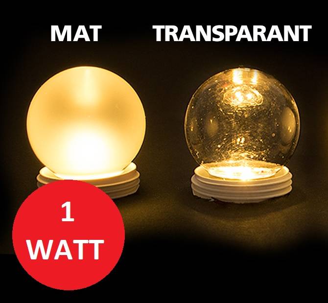 Unieke sfeervolle LED E27 Bol Lamp met 1w verbruik en 30/50 lumen aan lichtopbrengst. De zeer geringe lumen uitstoot vervangt een 8w gloeilamp. Zeer geschikt als sfeerverlichting in woonkamer, restaurant, bar, hotels of te gebruiken in prikkabels. De transparante kap zorgt voor een fijne lichtbeleving. De unieke 2000K Flame lichtkleur evenaart een kaars lichtkleur maar dan een tikje geler. De 2700K lichtkleur is een zeer fijne warm witte lichtkleur.