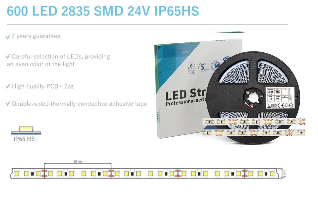Deze LED strip is voorzien van een IP65HS normering. Het verschilt tussen een IP65 en een IP65HS is dat de strip voorzien is van een krimpkous die de LED strip stof en spatwaterdicht maakt. Hierdoor is de strip vlakker en makkelijker te verwerken.