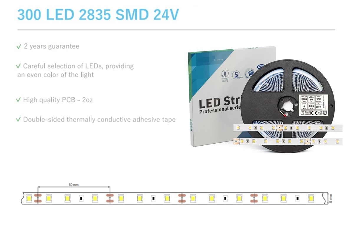 Deze led strip 2835 smd werkt op een 24v constante spanning. Wij hebben in ons assortiment diverse wattage 24v constante led strip drivers.