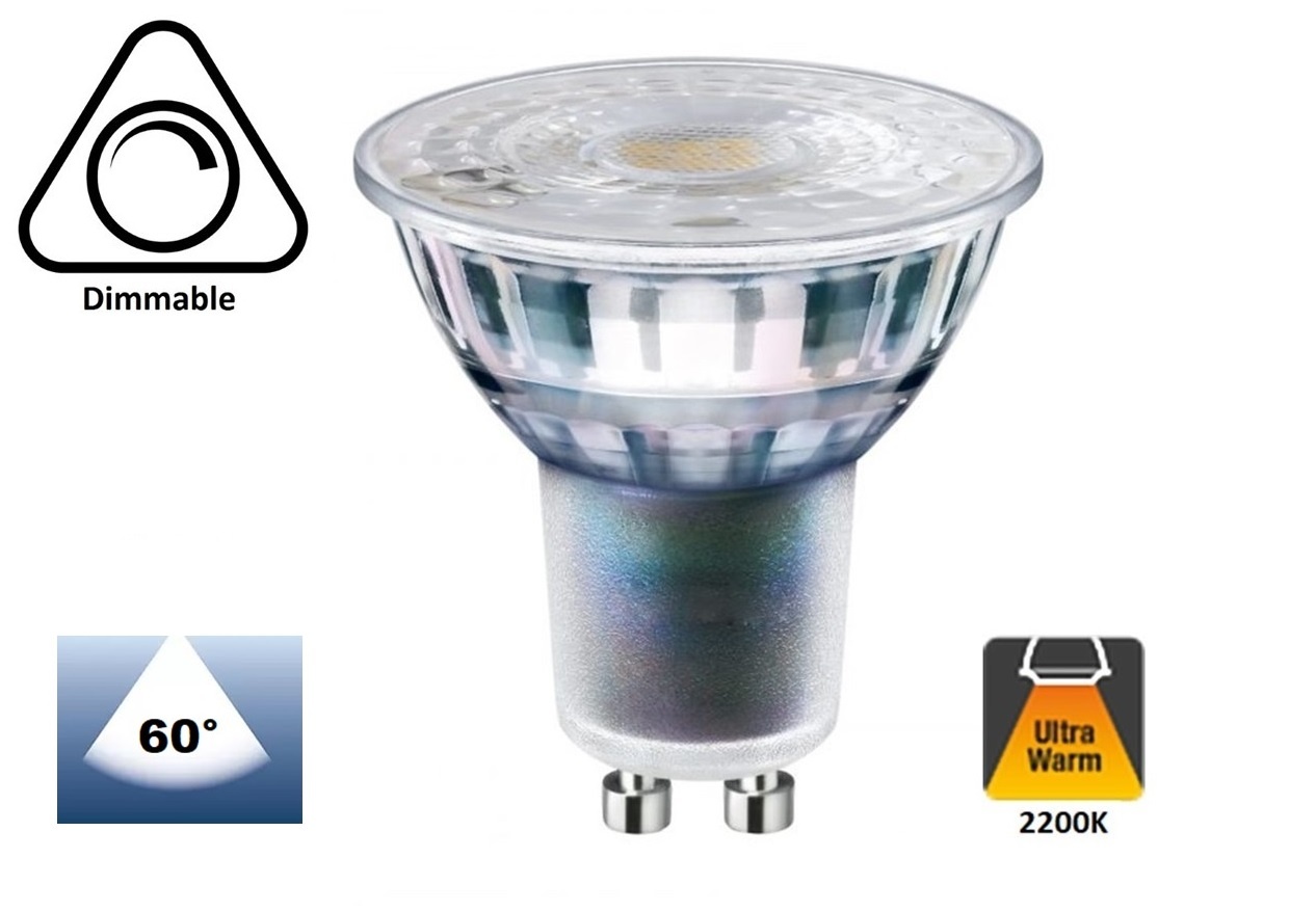 Hoogwaardige kwaliteit GU10 led spot dimbaar leverbaar in mooie 2200K Flame lichtkleur. De krachtige SMD Led met maar liefst 450 lumen zorgt voor een zeer goede belichting. De SMD Led chip in de dimbare GU10 5,5w Led spot maakt gebruik van de zelfde techniek als die van een COB led chip. Het licht van de GU10 5,5w Led Spot dimbaar komt uit één centraal punt, wat zorgt voor een egale belichting.