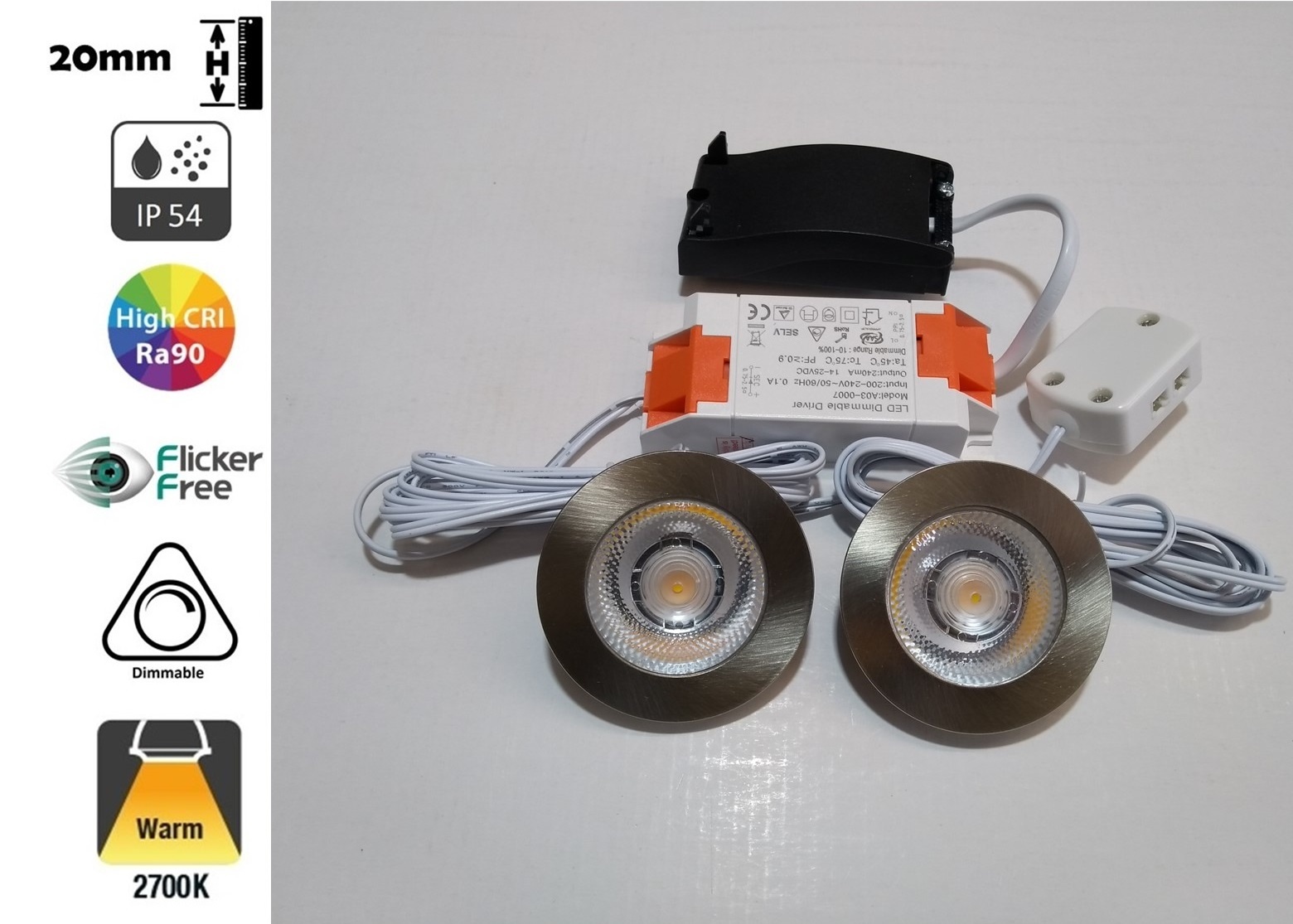 Deze complete Inbouw LED Spot Set 2x3w 2700K Warm wit is een zeer unieke led spot. Deze Inbouw LED spot Set bestaat uit 2x 3w LED Spots dimbaar met slechts 20mm hoog. Hierdoor zijn de inbouw led spots overal toepasbaar. Dankzij de IP54 normering kunnen deze Inbouw LED spots ook gebruikt worden in badkamers of vochtige ruimtes. Ook zeer geschikt voor montage in meubels, onder keukenkastje etc.