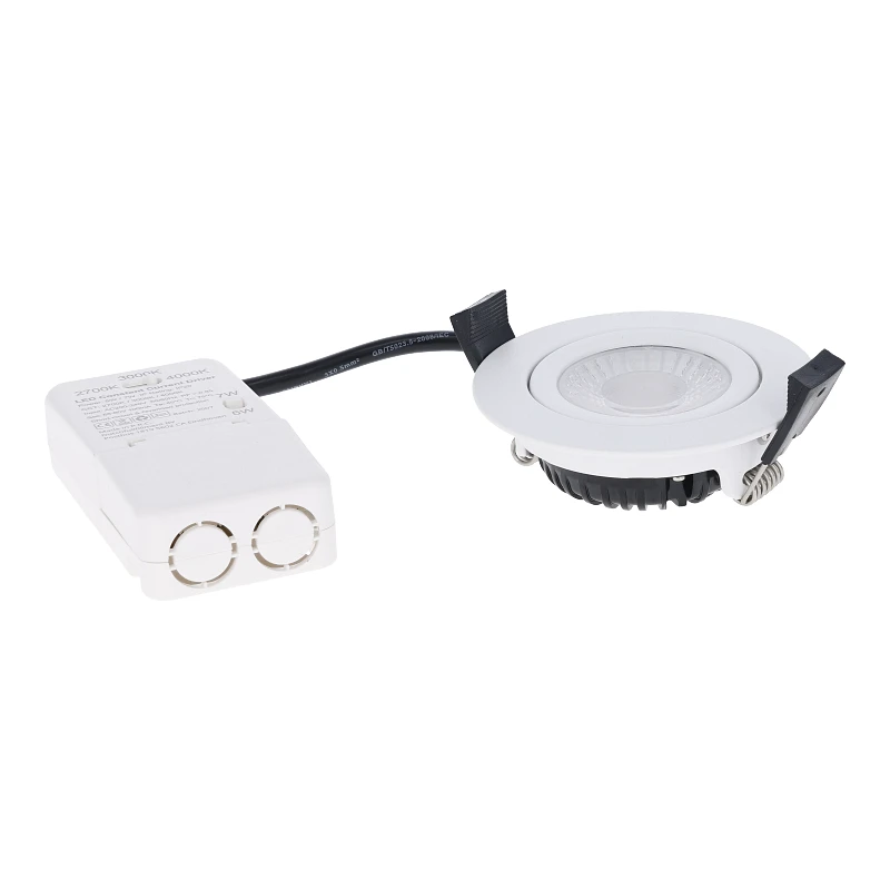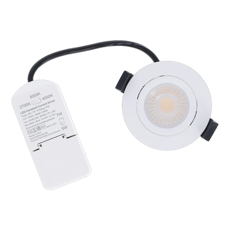 De LED Spot wordt geleverd met externe flikkervrije voeding van 10x4,5x2,4cm(LxBxH). Op de voeding kan je de lichtkleur aanpassen in 2300K, 3000K, 4000K en Dim To Warm. Ook is het mogelijk de wattage in te stellen op 5 watt en 7 watt