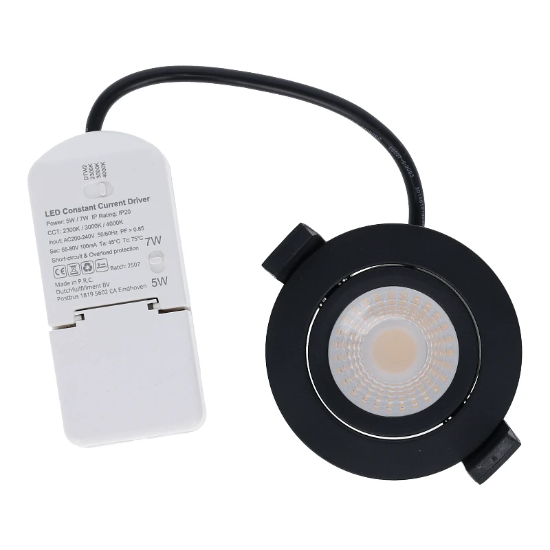 De LED Spot wordt geleverd met externe flikkervrije voeding van 10x4,5x2,4cm(LxBxH). Op de voeding kan je de lichtkleur aanpassen in 2300K, 3000K, 4000K en Dim To Warm. Ook is het mogelijk de wattage in te stellen op 5 watt en 7 watt