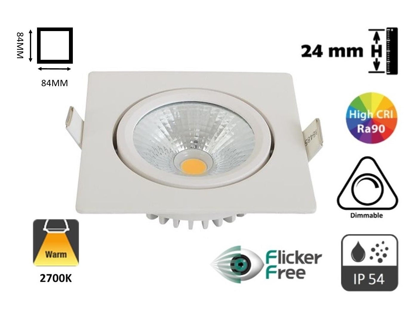 Complete Flat Inbouw LED Spot Vierkant 5w 2700K Dimbaar. Geschikt voor badkamers. Slechts 24mm inbouwhoogte!