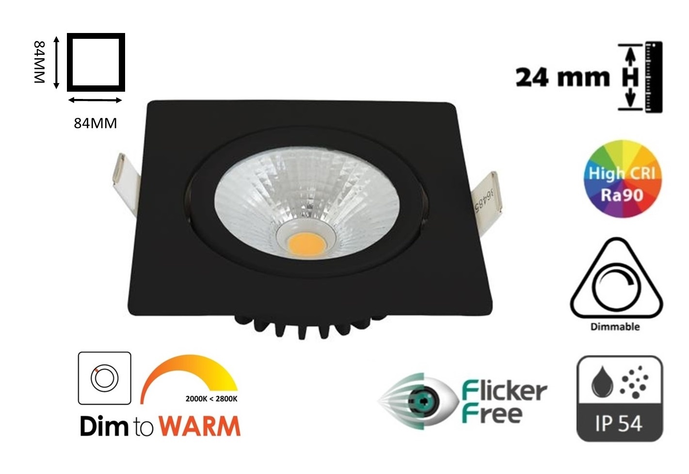 Deze complete Inbouw LED Spot Vierkant 5w Dim To Warm (2800K-2000K) is een zeer unieke led spot. De Inbouw LED spot 5w dimbaar is slechts 24mm hoog. Hierdoor is deze inbouw led spot overal toepasbaar. Dankzij de IP54 normering kunnen deze Inbouw LED spots ook gebruikt worden in badkamers of vochtige ruimtes.