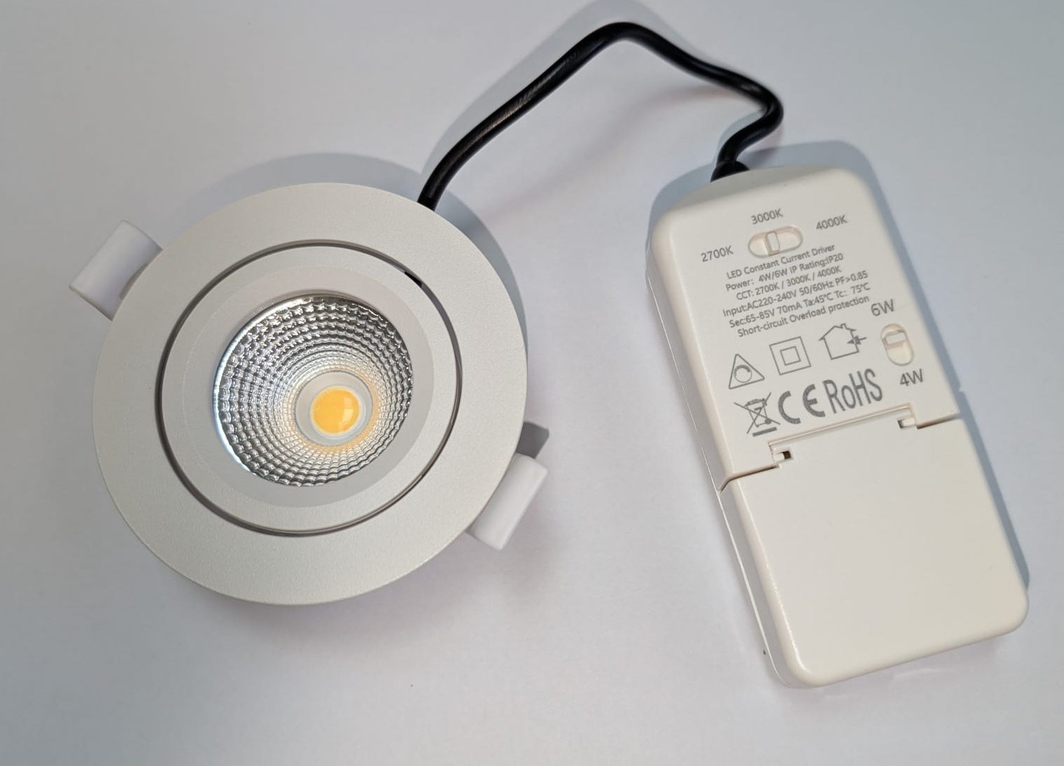 De Flat LED Spot wordt geleverd met externe flikkervrije voeding van 10x4,5x2,4cm(LxBxH). Op de voeding kan je de lichtkleur aanpassen in 2700K, 3000K en 4000K. Ook is het mogelijk de wattage in te stellen op 4 watt en 6 watt