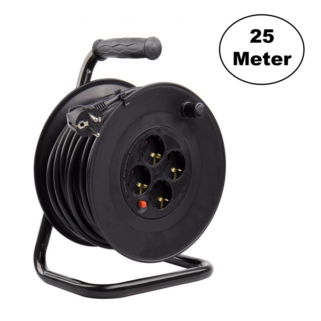 Deze kabelhaspel 25 meter is voorzien van type H05VV-F kabel met een doorsnede van 3x1,5 mm2 met een lengte van 25-meter en 4x Schuko stopcontacten van ieder 16A. Een product met zeer goede prestaties waarmee het mogelijk is om verschillende elektronische apparaten op het net aan te sluiten via de stekkers, zoals elektrische apparaten, elektrisch gereedschap, etc., waardoor ze op afstand kunnen worden gebruikt.