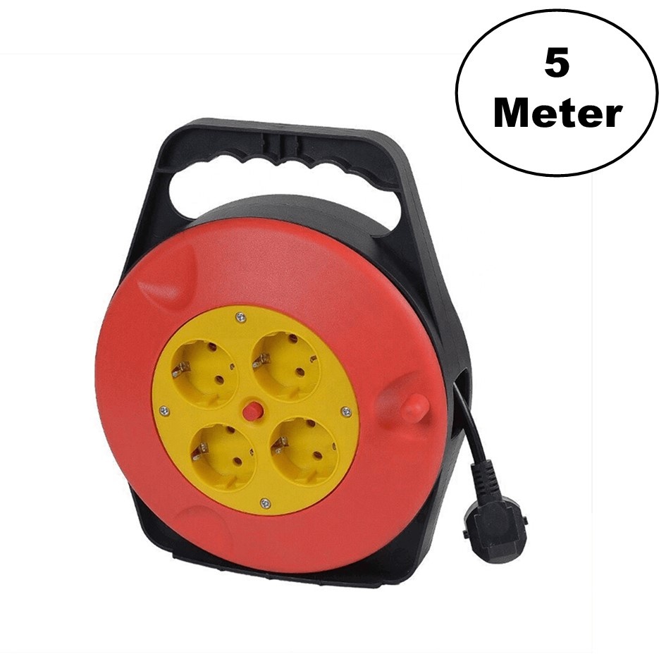 Deze kabelhaspel heeft een verlengbare stekker van 5m en 4x Schuko uitgangen met maximale belasting van 16 A op 220-240Vac. Dit product wordt rechtstreeks op het lichtnet aangesloten en kan verschillende elektrische apparaten van stroom voorzien (bijvoorbeeld: huishoudelijke apparaten, elektrische gereedschappen etc.). Deze kunnen op een grote afstand van het stopcontact gebruikt worden.
