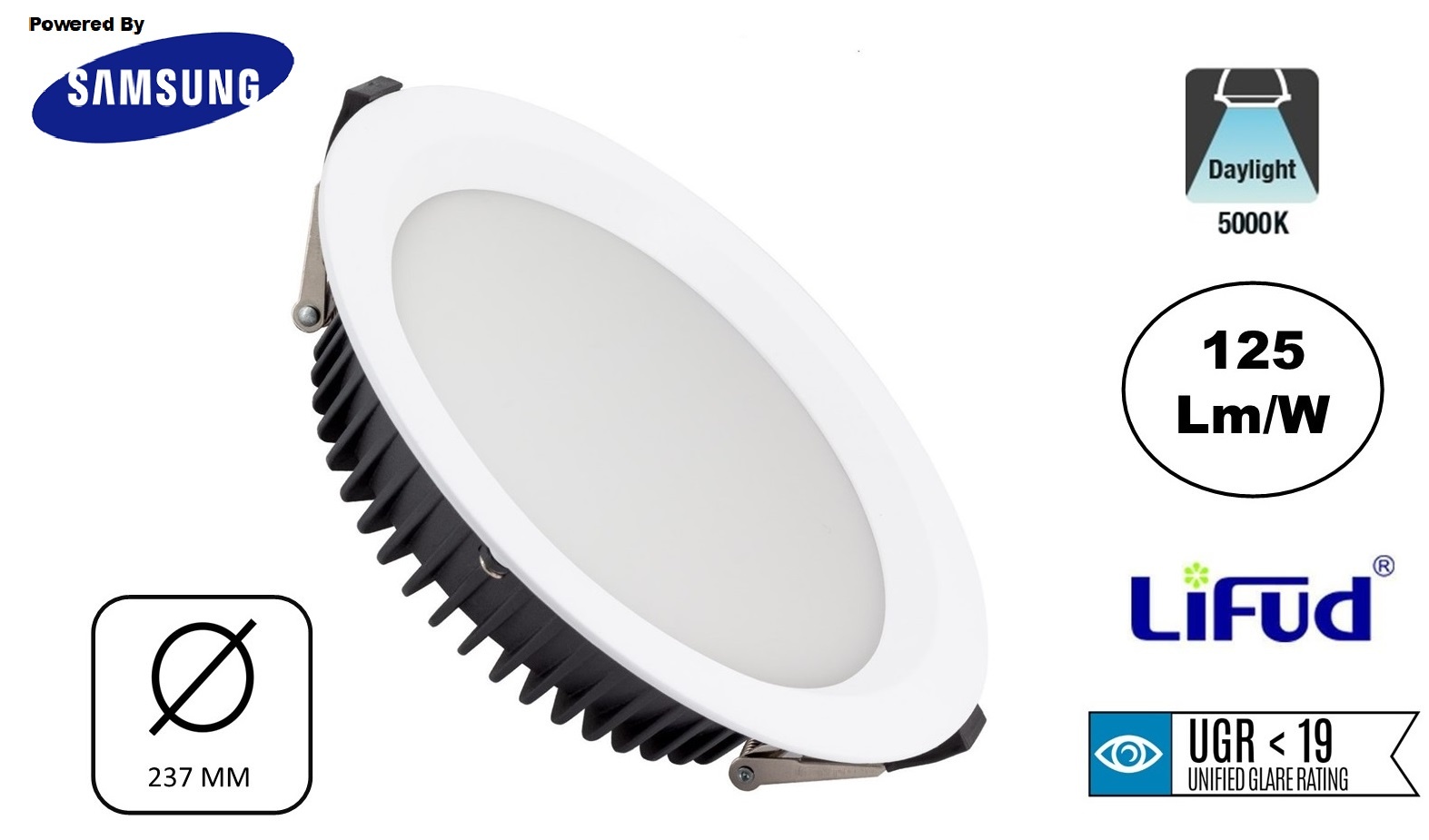 Deze zeer hoogwaardige kwaliteit LED Downlighter 50w is gemaakt van de beste kwaliteit componeten. De Led DOwnlighter is voorzien van zeer krachtige Samsung LEDS met 125 Lumen per watt en wordt geleverd met A kwaliteit Lifud LED Driver.