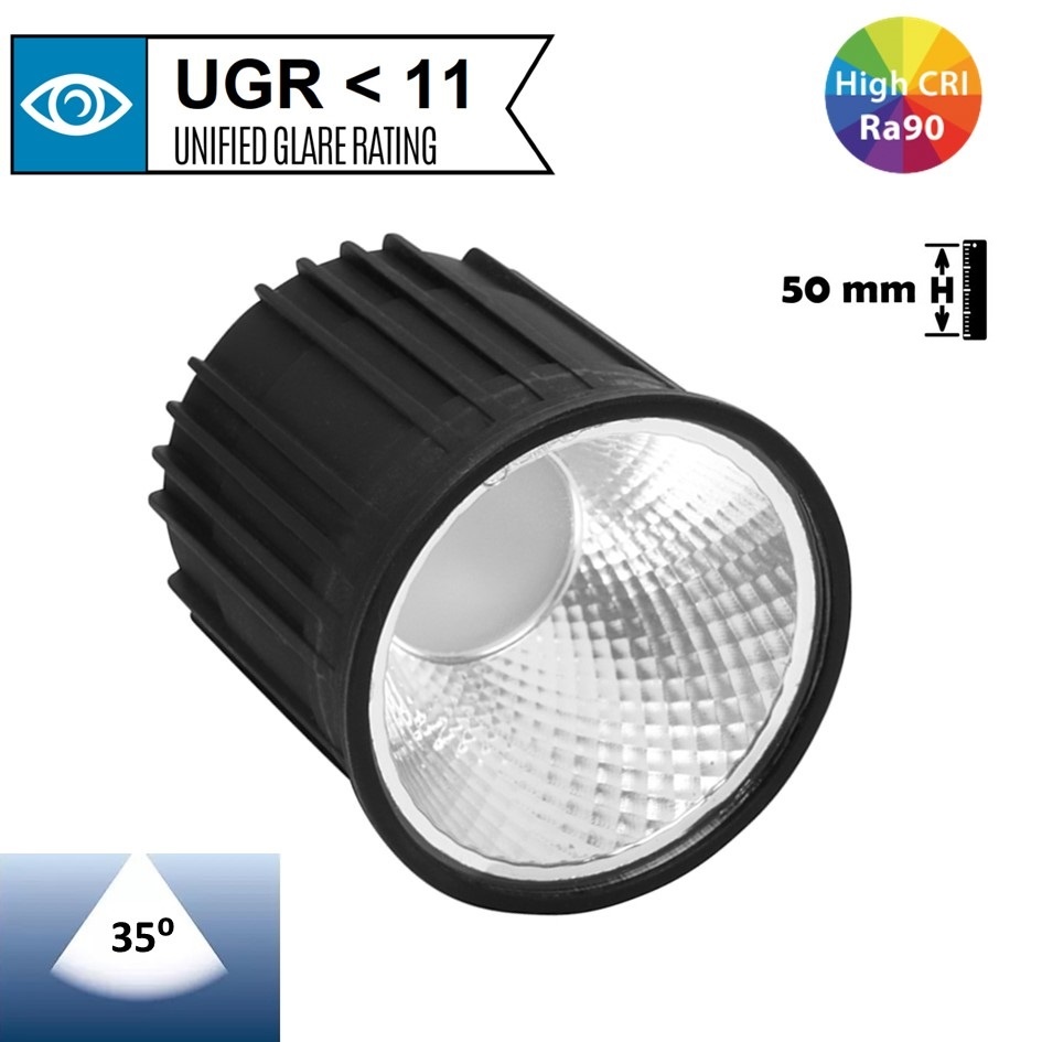 Deze LED Module 9w is een goed alternatief voor GU10 Spots. Dankzij de verdiepte LED is er een minimale verblindingsfactor UGR<11. De verdiepte LED in combinatie met de reflector spiegels maken de LED Module een LUXE LED Spot in elke ruimte.