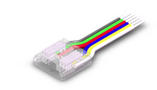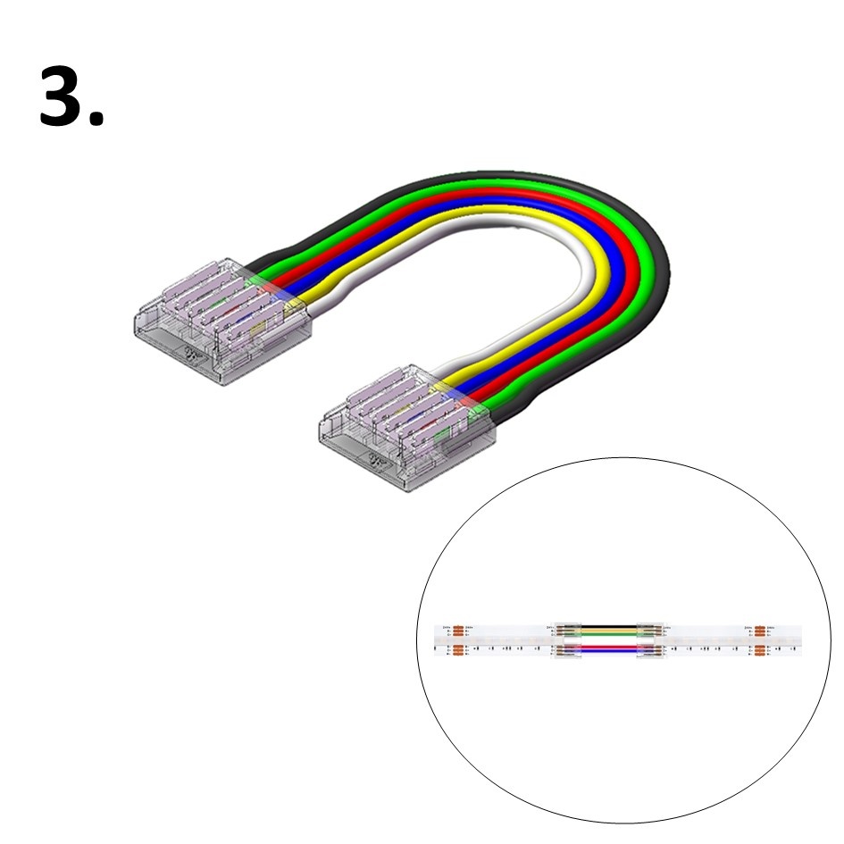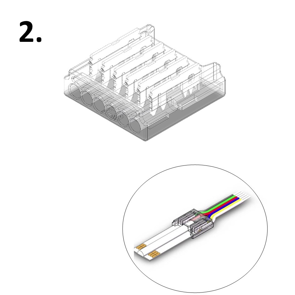 Tip! Gebruik de aansluitconnectoren ook voor het maken van strip tot strip connector waarbij je 2 aansluitconnectoren op een 6 aderig LED strip draad monteert. Ideaal wanneer je een tussenafstand tussen 2 LED strips wilt of wanneer je een hoekverbinding wilt maken.