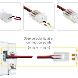 Tip! Gebruik de aansluitconnectoren ook voor het maken van strip tot strip connector waarbij je 2 aansluitconnectoren op een 2 aderig LED strip draad monteert. Ideaal wanneer je een tussenafstand tussen 2 LED strips wilt of wanneer je een hoekverbinding wilt maken.