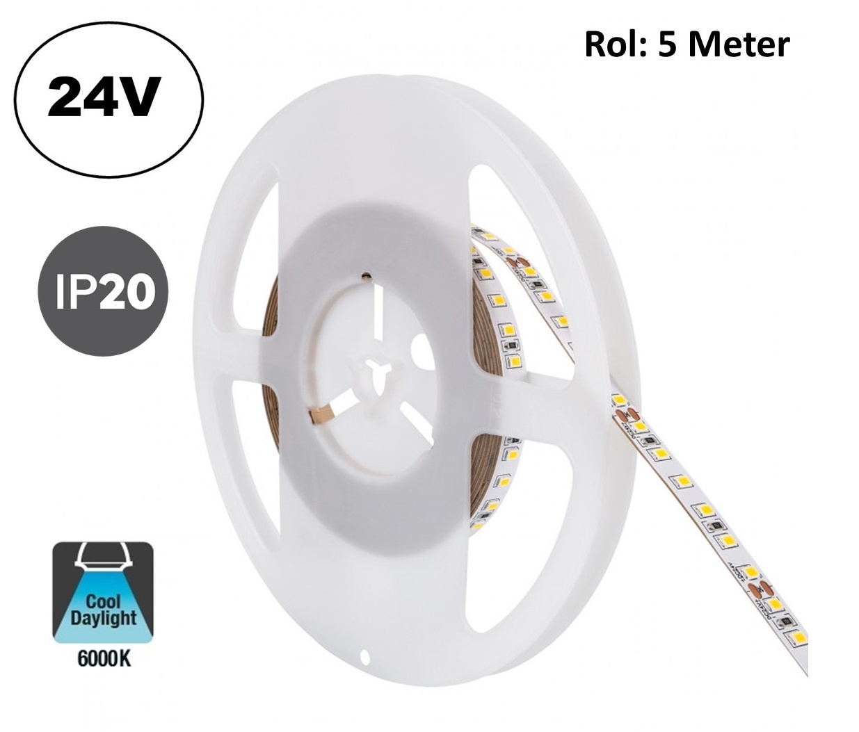 Deze led strip 2835 smd in 6000K Daglicht wit werkt op een 24v constante spanning. Wij hebben in ons assortiment diverse wattage 24v constante led strip drivers vanaf 75w leverbaar.