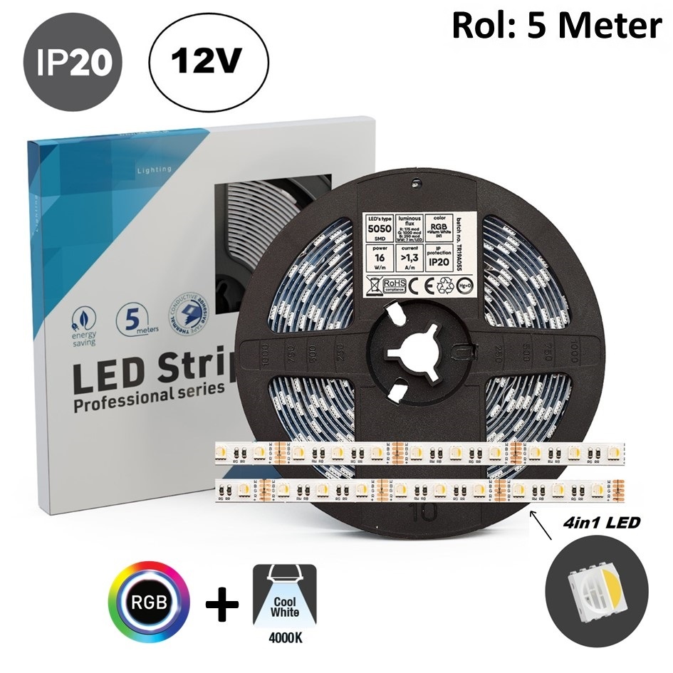 Deze RGB+ Neutraal Wit Led Strip met SMD 5050 heeft 60 leds per meter voorzien van RGB en neutraal wit functie waarbij je een 4 IN 1 LED hebt. Hierdoor licht elk LEDje op in de lichtkleur die je wilt. Met een zeer goede lichtopbrengst van Neutraal wit: 368 lumen, Rood: 101 Lumen, Groen: 276 Lumen en Blauw: 63 Lumen per meter. De RGBNW LED Strip is daarom zeer geschikt als sfeermaker in elke ruimte. Deze led strip heeft een IP20 normering wat betekent dat deze voor binnenshuis gebruik kan worden.