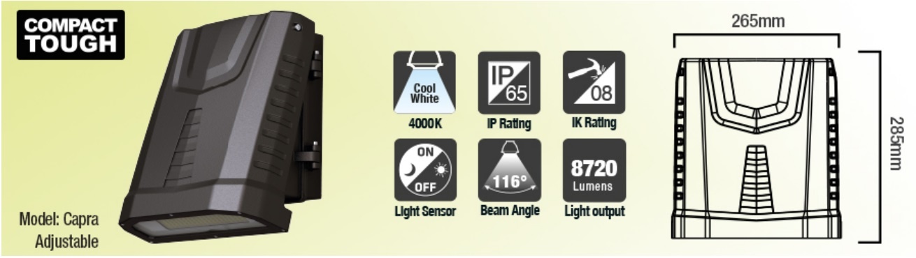 De Capra LED Wallpack 80w heeft 120lm/w verhouding met maar liefst 9840 Lumen aan lichtopbrengst totaal in lichtkleur 4000K Neutraal Wit. Dankzij de polycarbonaat diffuser wordt de belichting 116 graden verspreidt. Dit model heeft een 90 graden verstelbare kop om het licht te laten schijnen waar je maar wilt.