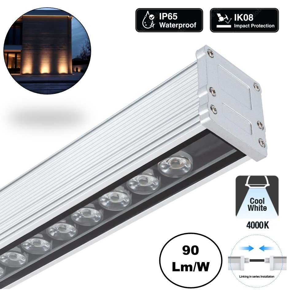 De hoogwaardige driver is geïntegreerd in de washer, zodat de installatie zeer eenvoudig is. Het biedt een instantontsteking, zodat het zelfs op podia kan worden gebruikt. Een van de grote voordelen van deze LED Wall Washer is de mogelijkheid om verschillende lengte LED Wall Washers samen te voegen tot een doorlopende lijn. Het bevat een ingangskabel en een uitgangskabel en kan tot 400W maximaal vermogen in één serie aansluiten.
