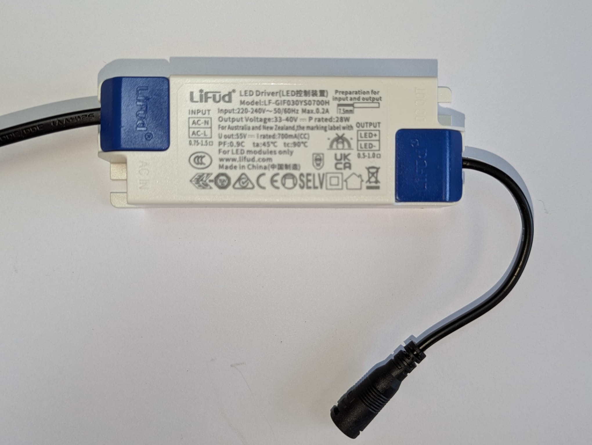 Deze led driver van het betrouwbare merk LIFUD wordt geleverd met 2 aderig snoer en snelconnector (mogelijkheid om te demonteren).
