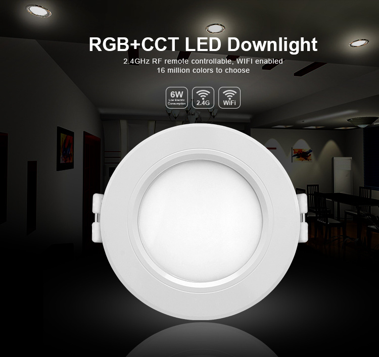 Deze LED Downlighter 6w RGB+CCT beschikt over alle kleuren van de regenboog inclusief Dual White (2700K-6500K). De Led Downlighter kan zowel met RGB+CCT afstandsbediening als met een smartphone (Apple/Android) worden bediend.