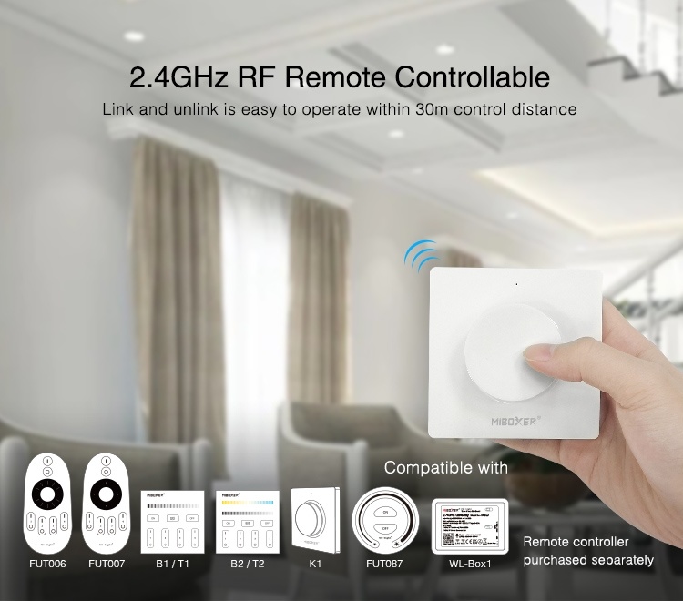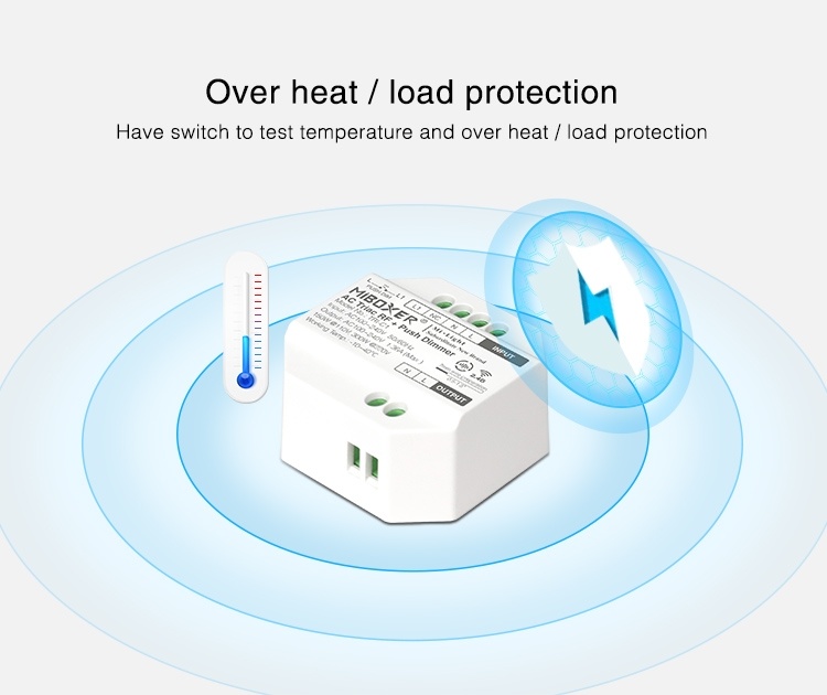 Deze draadloze Zigbee 3.0 ontvanger is geschikt voor het dimmen van 230v Led lampen en TRIAC dimbare LED drivers. Deze ontvanger is draadloos dimbaar met een Single Color RF Muurdimmer, met een Single Color RF Afstandsbediening of via een Zigbee aangestuurde App. De LED Dimmer werkt op de producten uit het Miboxer Assortiment. De totale uitgangsstroom kan maximaal oplopen tot 300W LED, houdt rekening met de powerfactor van de lamp x de opgegeven wattage.