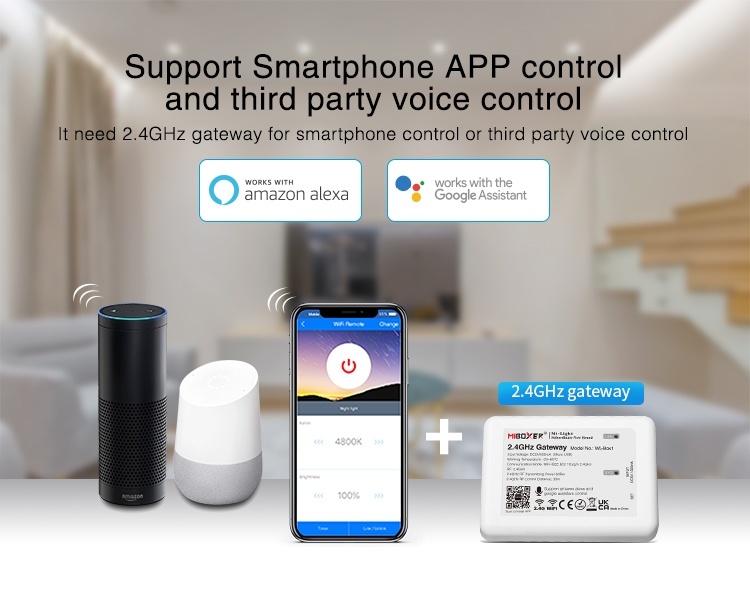 De Miboxer lampen zijn te bedienen via de Tuya App. Hiervoor heb je een Miboxer Smart Hub Nodig nodig (artikelnummer ZB-Box1 of ZB-BOX2) of maak gebruik van HUE of andere Zigbee Hub. Met de app is het mogelijk de lamp in gewenste lichtkleur in te stellen en de dimmen. Ook is het mogelijk via spraak aan te sturen. De app dient dan gekoppeld te worden aan Google of Alexa.