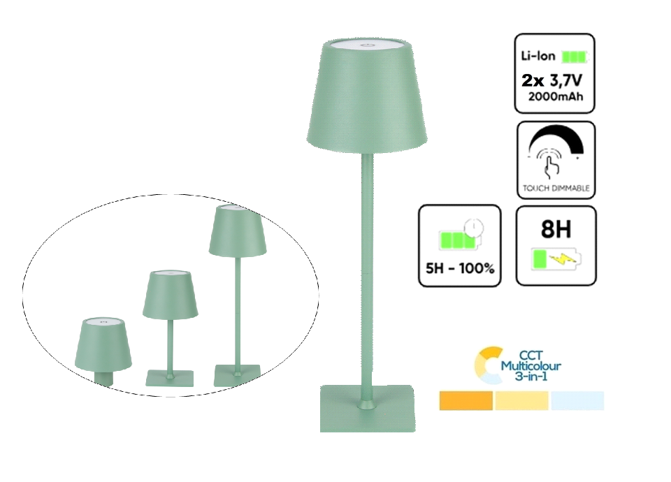Oplaadbare LED Tafellamp Groen 4 IN 1, 3,5w, 400 Lumen, 2x 2000Mah Li-Ion batterij, CCT Switch 3000K/4000K/5000K, IP54, 2 Jaar Garantie