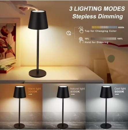 De lamp wordt bediend met één enkele toucheknop. De het aanraken van de knop kan je de lamp in 3 lichtkleuren veranderen; 3000K warm wit, 4000K Neutraal wit en 5000K Puur wit. Wanneer je de knop blijft aanraken kan je de lamp dimmen naar gewenste sterkte. Doordat er geen netsnoer nodig is, kan de lamp op elke gewenste plek geplaatst worden.