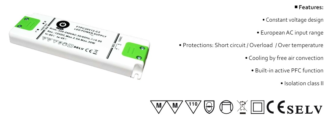 Deze POS Led strip voeding is geschikt voor gebruik op alle soorten 12v DC led strip. De POS LED voeding wordt gekenmerkt door zijn compacte afmetingen, slanke ontwerp en lage gewicht. Hierdoor is toepassing zelfs in de meest veeleisende ruimtes mogelijk. De LED strip voeding voldoen aan de internationale verlichtingsnormen en zijn voorzien van kortsluitings-, overstroom-, overspannings- en thermische beveiliging.