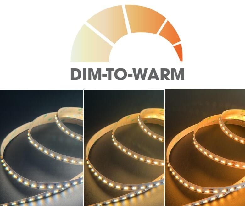 Deze SMD Led Strip is voorzien van een Dim To Warm Functie waarbij de ene helft van de strip is voorzien 3000K Warm wit lichtkleur en de andere helft van de strip met 2000K Flame Lichtkleur. De lichtkleur vermengen zich met elkaar waardoor de lichtkleur traploos steeds warmer van lichtkleur tot 2000K Extra warm (flame) wordt.