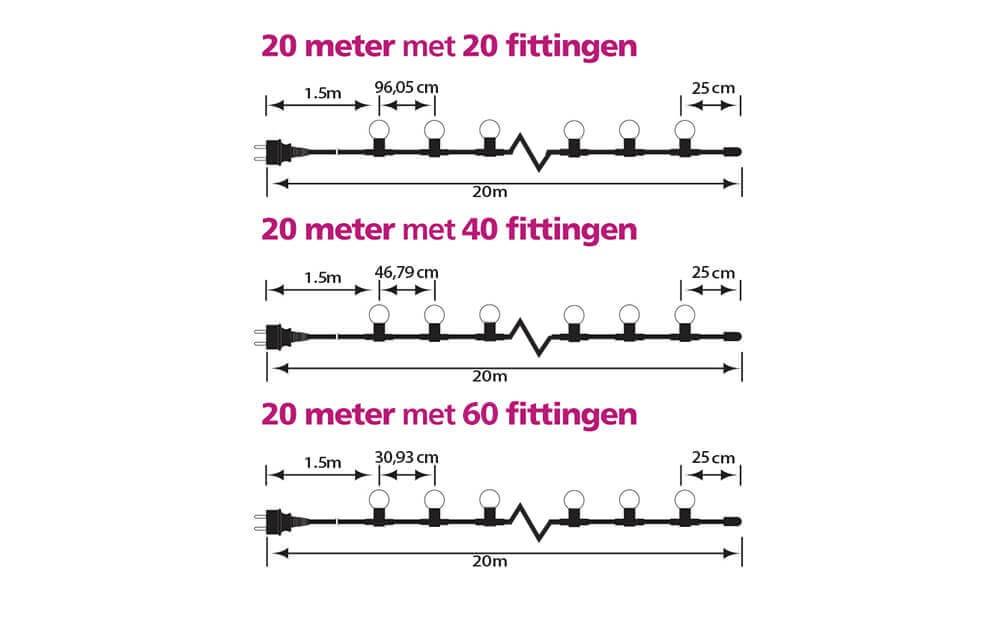 Let op, de prijs van de prikkabel is exclusief LED lampen. Als u ook lampen wilt bestellen dan kunt u ons complete overzicht vinden onder ‘Prikkabel > Prikkabel led lampen’.
