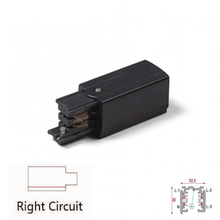 Met deze 3 Fase Rail aansluitblok rechts is het mogelijk de 3 Fase rail 4 wire Zwart te voorzien van spanning. De aansluitblok kan gebruikt worden op de 1 meter, 1.5 meter, 2 meter en 3 meter rails.