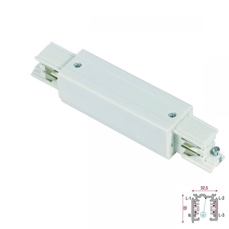 Met deze 3 Fase Rail aansluitblok midden is het mogelijk de 3 Fase rail 4 wire wit te voorzien van spanning. De aansluitblok kan gebruikt worden op de 1 meter, 1.5 meter, 2 meter en 3 meter rails.