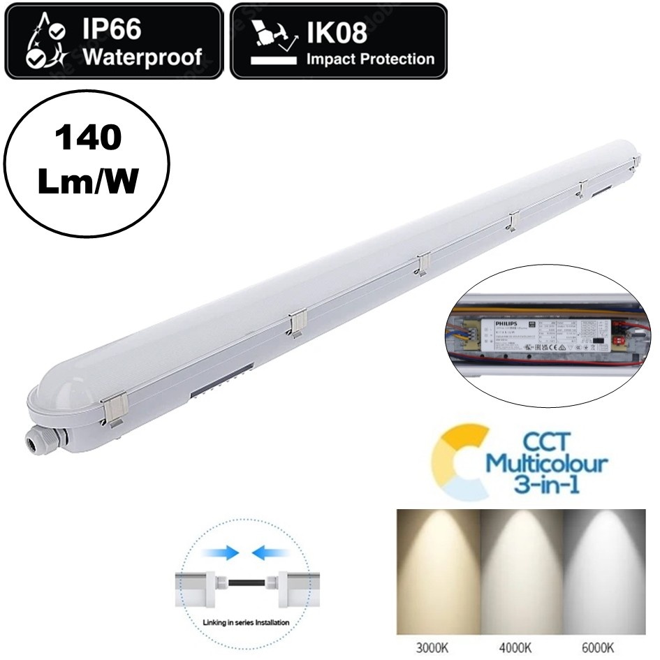 De LED Batten 150cm is zeer geschikt ter vervanging van een dubbel TL armatuur 150cm (116w + vsa = 135-150w). Door de zeer hoge lichtopbrengst en de 120 graden lichthoek wordt er een betere belichting gecreëerd. Dankzij de CCT kleuren switch en Wattage Switch kan je zelf de gewenste lichtkleur en lichtsterkte bepalen. Je hebt dus een 12 in 1 LED armatuur.