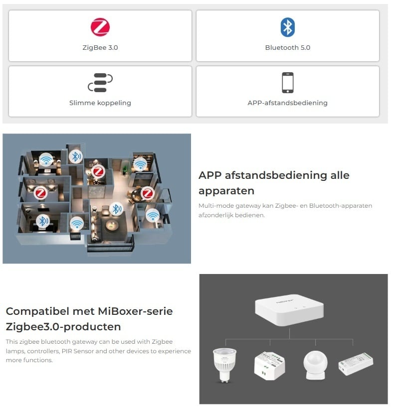 De MiBoxer ZB-BOX3 is ontworpen om zoveel mogelijk apparaten te ondersteunen, ongeacht het protocol dat ze gebruiken. Dit betekent dat u één gateway kunt gebruiken voor apparaten die werken via: