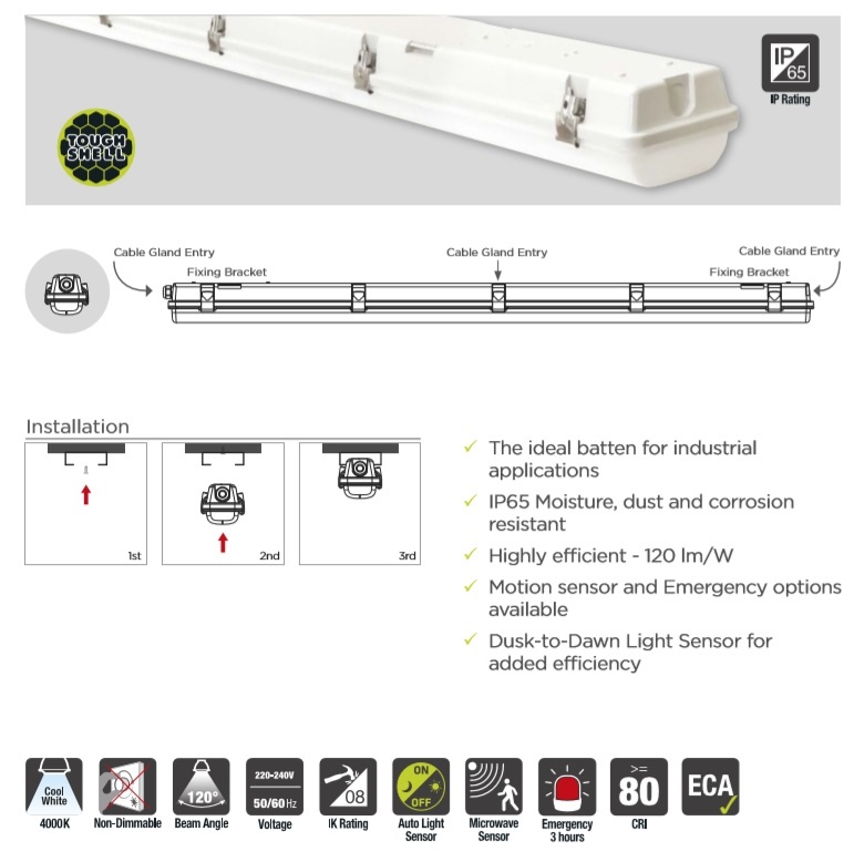 De Toughshell led Batten is zeer gemakkelijk te installeren dankzij de bijgeleverd RVS montagebeugels. Ideaal voor het 1 op 1 vervangen van oude conventionele TL armaturen. De zeer hoge 120lm/w verhouding met een lichtopbrengst van 5400 Lumen vervangt een dubbelbuis TL armatuur. De bijgeleverd Tridonic driver is in het armatuur weggewerkt. Tridonic is één van de beste LED drivers bij gebruik in zakelijke verlichting.