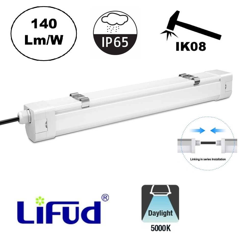 Deze LED Tri Proof 120cm is voorzien van krachtige Bridgelux High Lumen LEDS met zeer hoge 140 Lumen/watt verhouding. Er komt geen aparte LED Buis aan te pas. Hierdoor is de installatie van de LED Tri Proof 120cm zeer eenvoudig en snel. De LED Tri Proof is voorzien van een Lifud LED Driver.