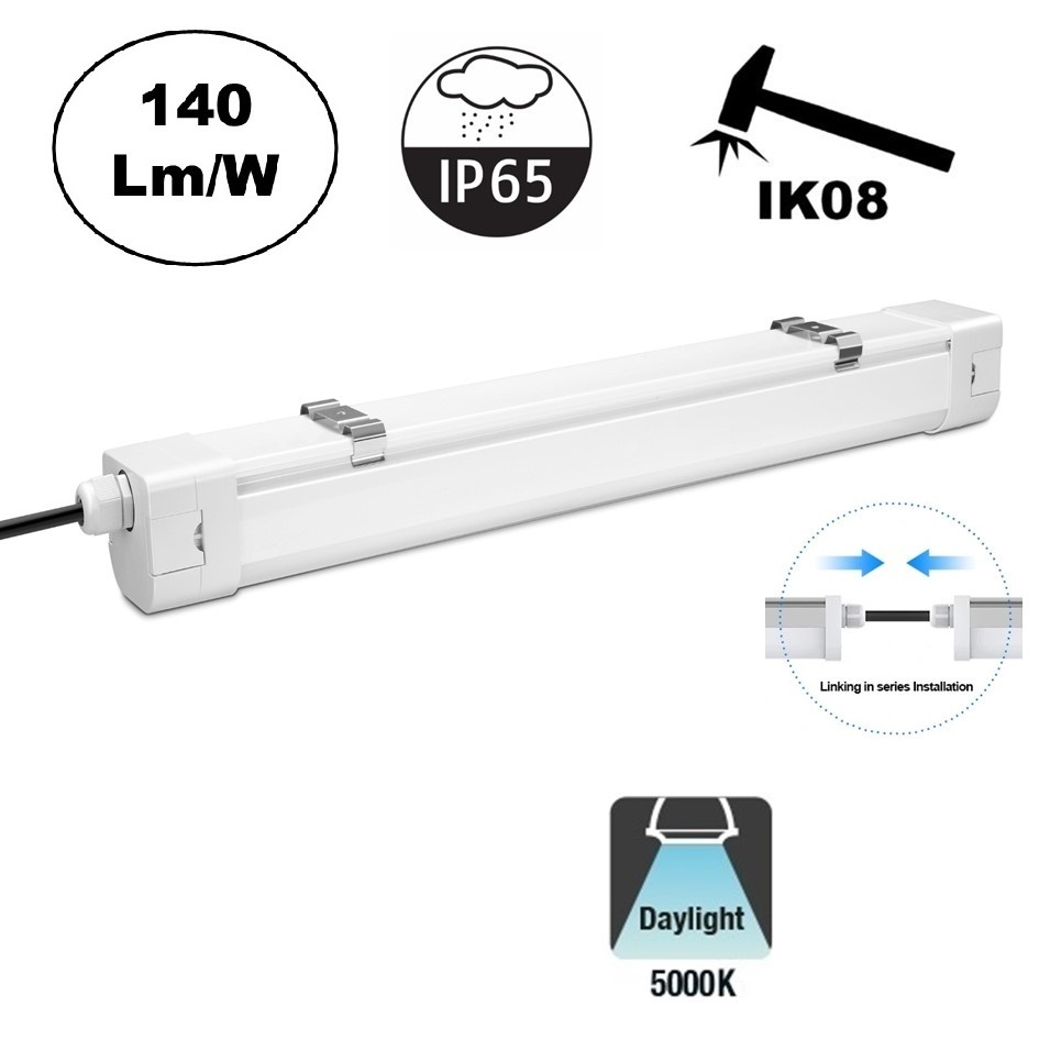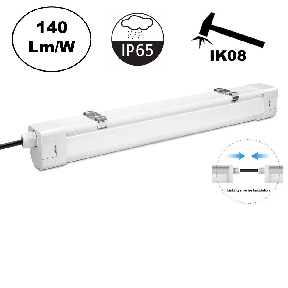 Zeer hoogwaardige kwaliteit spatwaterdichte (IP65) LED Tri Proof 150cm met maar liefst 140 lumen per watt. Armatuur is gemaakt van zeer stevig Polycarbonaat kunststof met aluminium heat sink en RVS bevestigingsmaterialen. Het led armatuur wordt geleverd met; RVS montagebeugels en PG13.5 wartel met moer.